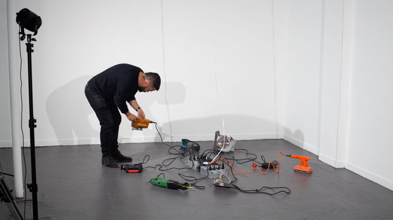 In this durational performance, eight corded power tools are arranged around two switching power supplies. A DMX processor has been programmed to randomly turn on and off the eight tools at different times and for different durations: one, two and occasionally three at a time.